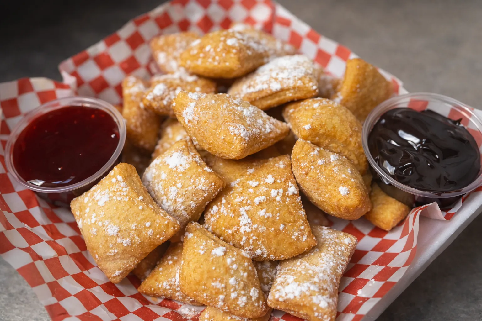 Our Famous Dough Tossed With Sugar Powder, And Choose Your Sause Raspberry Or Chocolate